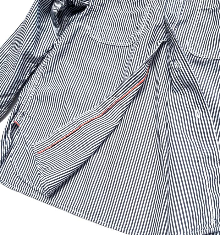 兵庫県西脇市で織り上げたオリジナルのセルヴィッチ生地を使用したシャツ。トラディショナルなストライプ柄は上品で大人のスタイルに馴染み、適度なハリと柔らかさを兼ね備えています。コットン100%で通年着用でき、ブランドを象徴するオレンジのミミがアクセントに。