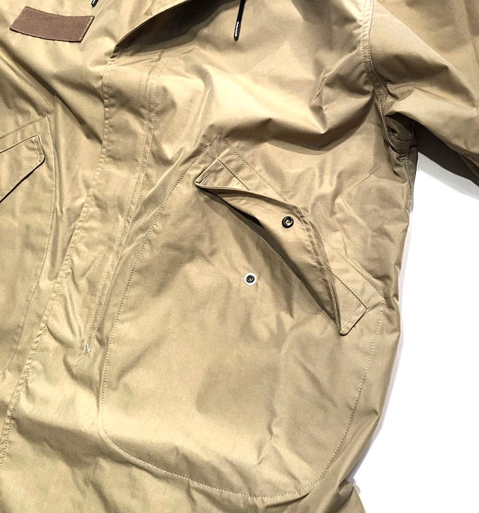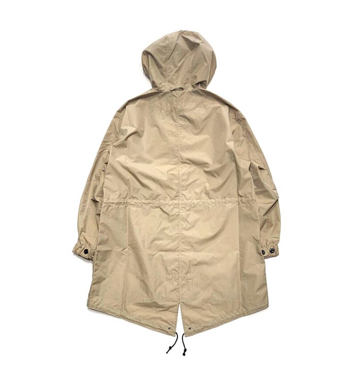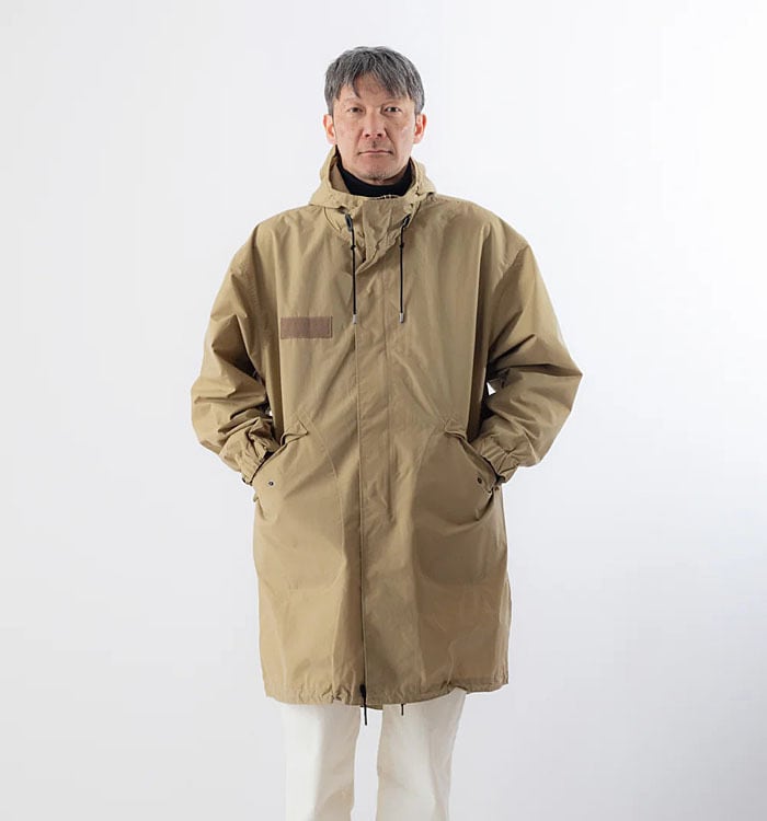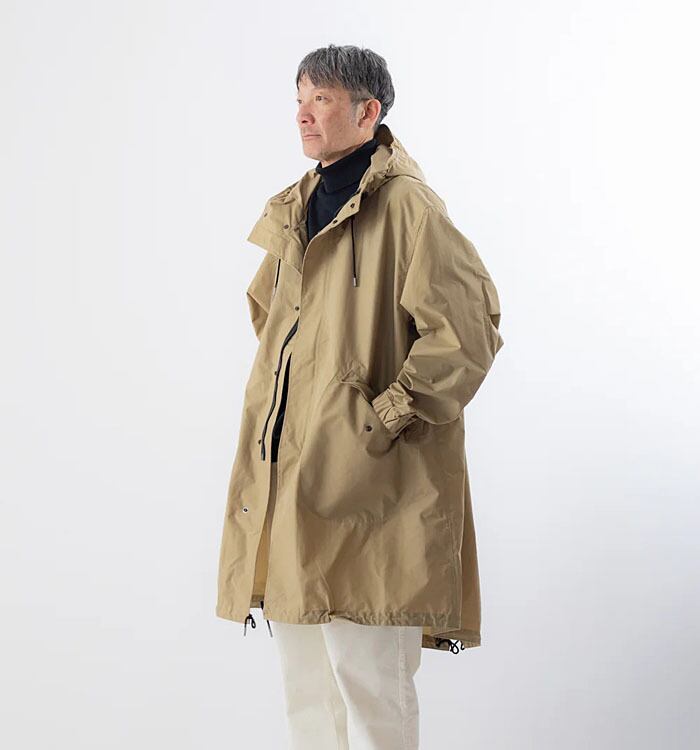 防水性・防風性・透湿性を兼ね備えた高機能素材を使用。マットで上品な表面感と程よいハリがあり、シンプルながら存在感のある仕上がりです。ミリタリーコートをベースに、ディテールをそぎ落としたミニマルなデザインは、街に自然と馴染む都会的な印象。