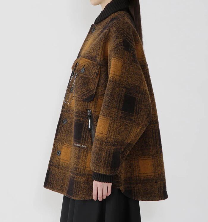 ウールポリエステルの混紡糸をオリジナルのチェック柄に編み上げ、縮絨と起毛加工を施すことで、ふっくらとした風合いに仕上げたアウター。柔らかな質感ながら適度なハリがあり、上品で落ち着いた印象を与えます。