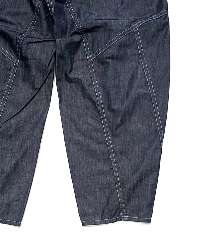 縫製には20番手の太い糸を使用した巻き縫い仕様を採用し、随所に現れるパッカリングが程よい立体感をプラス。無骨になりすぎず、シンプルなトップスと合わせても雰囲気の出る一本に仕上がっています。