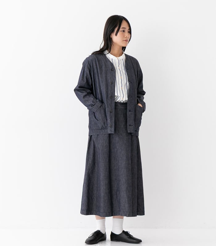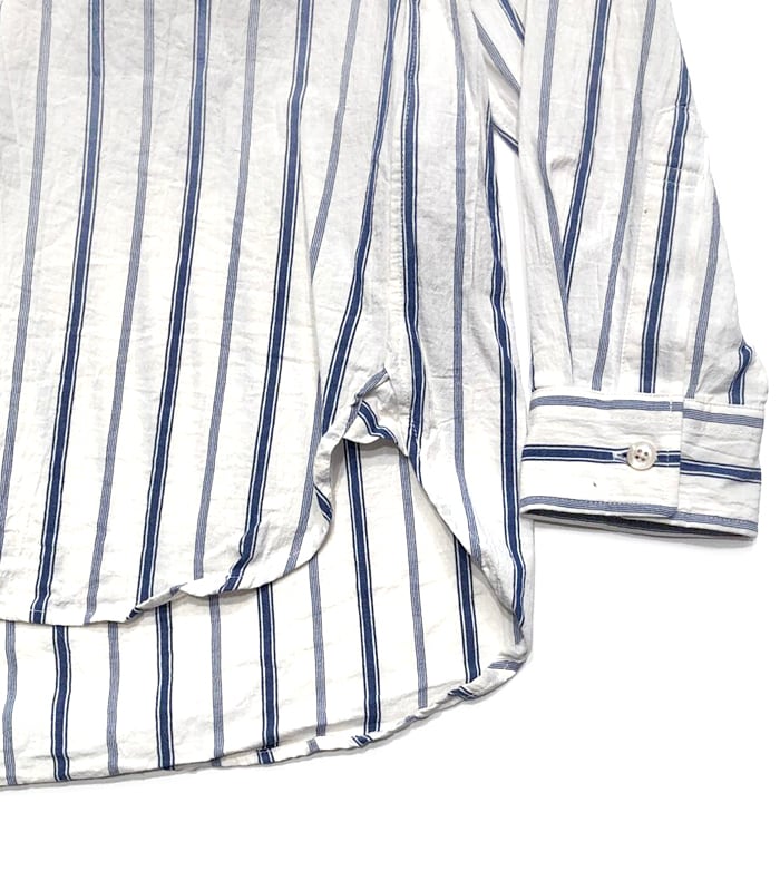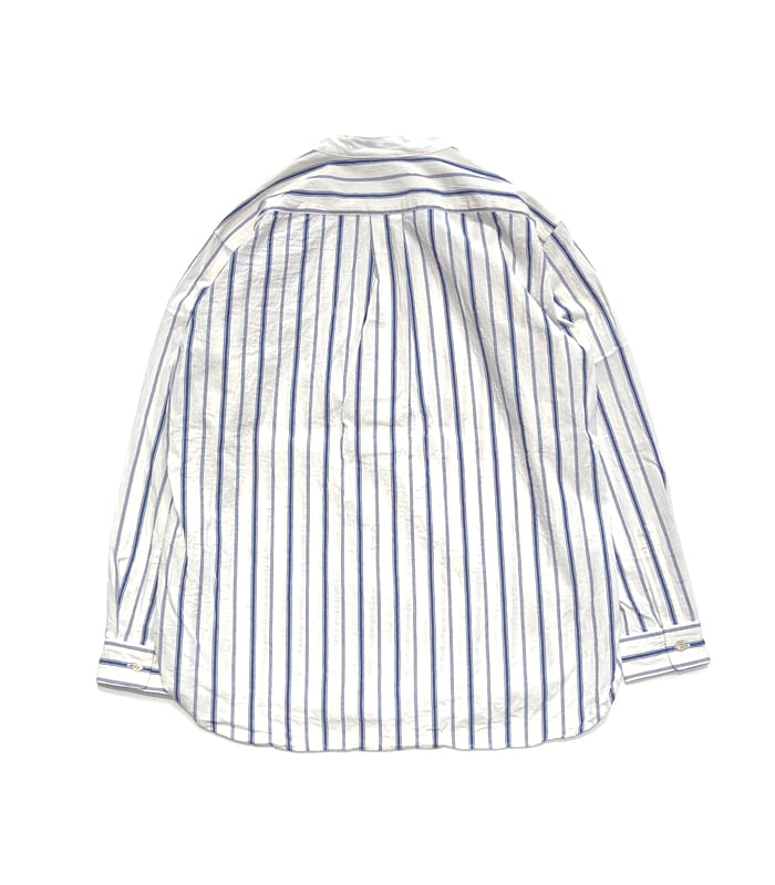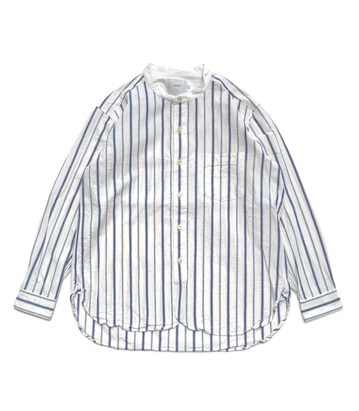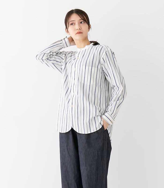 オーガニックコットンのやさしい風合いと、凛としたストライプ柄が印象的なスタンドカラーシャツ。オフホワイトをベースにブルーの縦ラインを配することで、爽やかさの中にきちんと感を添えた一着です。クレリック仕様のスタンドカラーが、さりげないアクセントとして全体を引き締めます。
