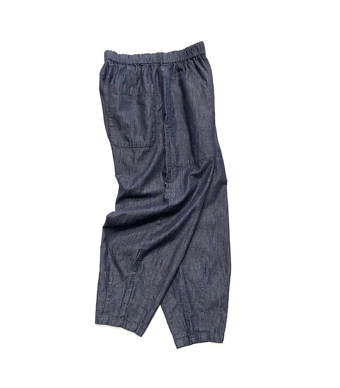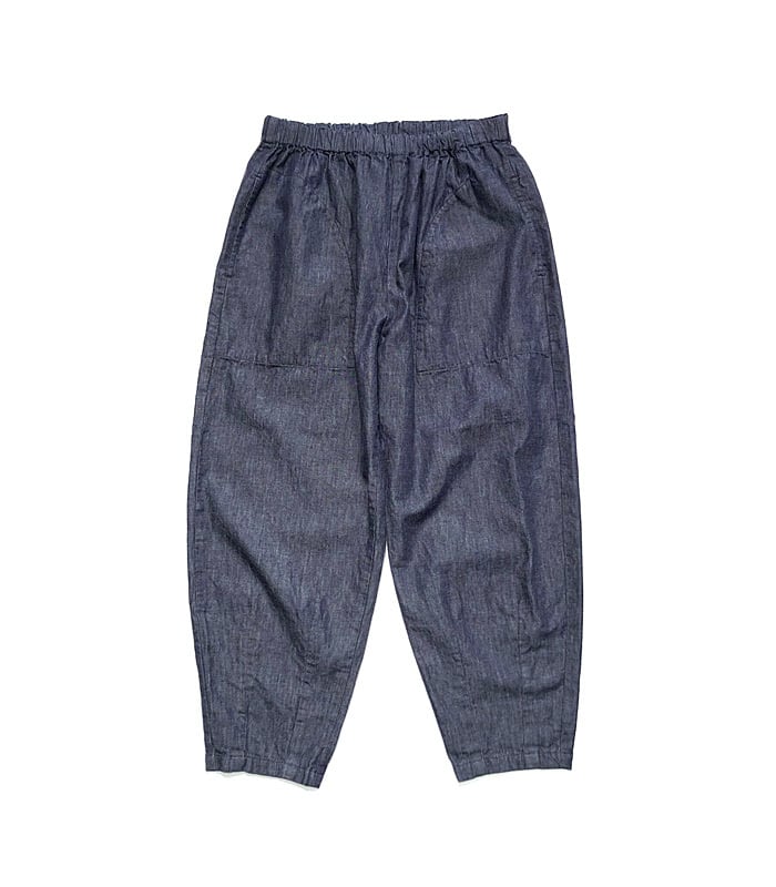ゆとりのあるワタリと、裾に施されたダーツによって丸みのあるシルエットを形成。トップスとのバランスも取りやすく、カジュアルから少しきれいめまで幅広いコーディネートに対応します。ウエストはゴムと紐で調整可能なイージー仕様です。